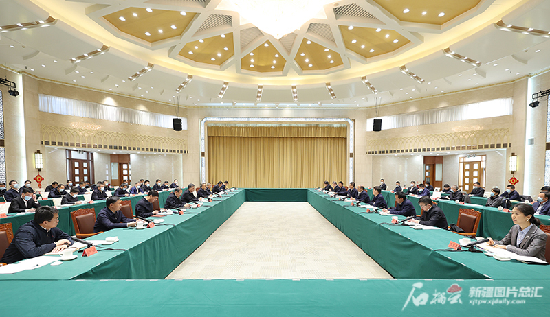 自治区党委副书记、自治区主席艾尔肯·吐尼亚孜主持会议。自治区党委副书记,兵团政委李邑飞,自治区党委副书记张春林出席会议。